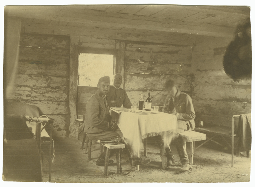 Gli ufficiali dello squadrone tecnico del 12. Reggimento Ulani dopo il pranzo: il tenente Juhasz, il capitano Chiachich e il sottotenente Grafi. Si pranza in una casa danneggiata e presto riparata