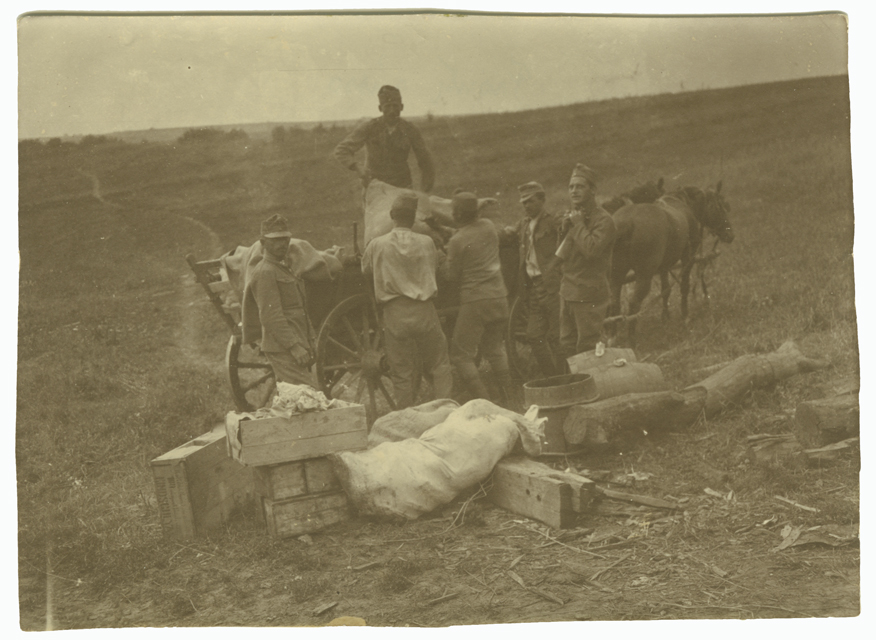 E' arrivato il carro con le provviste per il 12. Reggimento Ulani. Si tratta dello stesso scatto stampato in momenti diversi e con commenti diversi manoscritti sul verso