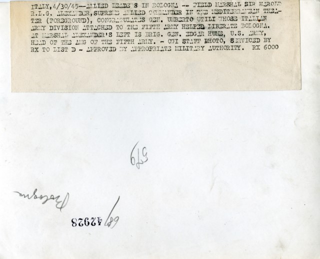 Umberto Utili (1895-1952) è stato un generale di divisione, comandante del Corpo Italiano di Liberazione durante la seconda guerra mondiale. Figlio di un ufficiale di fanteria, partecipa come tenente del 17° artiglieria al primo conflitto mondiale, quindi come tenente colonnello comandante d’artiglieria nella 1ª divisione eritrea nella guerra in Africa orientale nel 1936 in cui fu decorato al valore militare nella battaglia di Mai Ceu. Nel secondo conflitto mondiale è impegnato nel 1940 come colonnello al comando d’artiglieria del XXVI C.A. nella campagna di Grecia e sul fronte russo con lo C.S.I.R. nello stato maggiore del generale Giovanni Messe, l’8 settembre si trova in Puglia, quando le truppe alleate cominciano l’avanzata verso nord. A fine gennaio 1944 subentrò al generale Vincenzo Dapino al comando del Primo Raggruppamento Motorizzato che sotto il suo comando viene trasformato nel Corpo Italiano di Liberazione, alle dipendenze dell’8ª Armata britannica. Dopo le battaglie dei primi mesi del 1944 il generale Utili propone agli alleati un potenziamento delle forze italiane, gli alleati accettano e l’organico viene portato a 25.000 uomini suddiviso in gruppi di combattimento, Utili comandò il Legnano fino alla conclusione del conflitto. Nell’immediato dopo guerra comandò il 3° Corpo d’Armata di Milano. Morto nel 1952, è sepolto nel cimitero militare di Mignano Monte Lungo, dove sono state raccolte 975 caduti durante la guerra di liberazione. Testo tratto dal sito https://www.combattentiliberazione.it/corpo-italiano-di-liberazione-c-i-l Feldmaresciallo britannico (contea di Tyrone, Irlanda settentr., 1891-Slough, Londra, 1969). Partecipò alla Prima guerra mondiale, ebbe poi incarichi in India e venne nominato maggior generale (1937). Nella Seconda guerra mondiale comandò (1940) il corpo di spedizione britannico durante la ritirata di Dunkerque; trasferito in Medio Oriente (1942), divenne poi comandante in capo delle forze britanniche nell’Africa settentr. (1943) e, poco dopo, delle forze alleate in Italia; il 28 sett. 1943, insieme al generale Eisenhower, ricevette il maresciallo Badoglio per la firma dell’armistizio «lungo». Ebbe parte decisiva nella condotta della campagna d’Italia: suo il proclama che nel nov. 1944 invitava i partigiani a sospendere le operazioni su vasta scala. Il 26 nov. 1944, promosso maresciallo e divenuto comandante supremo delle forze alleate nel Mediterraneo, prese anche il comando delle operazioni di sbarco nella Francia meridionale. Dal 1946 governatore generale del Canada e visconte, fu anche ministro della Difesa (1952-54). Testo tratto da https://www.treccani.it/enciclopedia/harold-rupert-leofric-george-alexander_(Dizionario-di-Storia)/