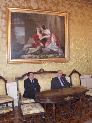 Il sindaco Roberto Dipiazza e l'ambasciatore cinese Chen Wen Dong al Museo Revoltella ammirano la scultura "Il taglio dell'istmo di Suez "ed il quadro "Paolo e Francesca"./p