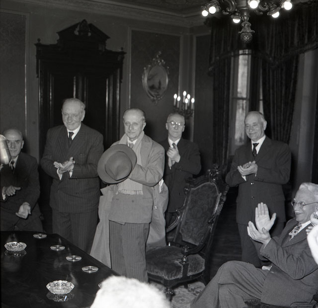 Una delegazione di 18 dei 150 studenti che nel 1904 si batterono a Innsbruck per chiedere l'istituzione a Trieste dell'Università italiana sono stati ricevuti dal Sindaco dopo aver deposto una corona d'alloro sulla lapida di Via Filzi ed essere stati accolti dal rettore dell'Università, Rodolfo Ambrosino. Testo tratto dal Piccolo sera, 16.11.1954.