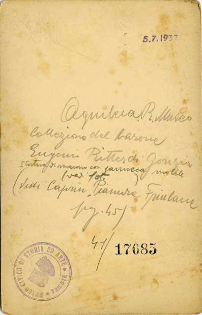 Testa femminile con parrucca mobile di piccole dimensioni (9,5 cm) realizzata in basalto. Si tratta di un ritratto idealizzato di giovane donna alla quale i tratti fisionomici ben marcati - quali il volto largo, gli occhi leggermente sporgenti con le pupille e le iridi incise, le labbra leggermente socchiuse - conferiscono volutamente un "carattere" che la distanzia dalla fissità propria dei tipi di divinità. Dibattuta è la sua identificazione e cronologia: G. Brusin la ritiene un "tipo ideale, generico" di fine II sec. d.C. mentre F. Squarciapino ne propone un'attribuzione all'età antonina e vi riconosce, per confronto con la statuaria di dimensioni maggiori, il ritratto di Faustina Minore. La studiosa collega inoltre la diffusione di queste piccole immagini al culto dei lari, per il quale sovente si ricorreva ai genii degli imperatori. La fotografia ritrae il medesimo soggetto della foto F17084, alla quale si rimanda per ulteriori considerazioni. La fotografia è stata utilizzata da V. Scarpa per realizzare il disegno pubblicato nel volume di Caprin, "Pianure friulane" (1892), che la riproduce a fianco del soggetto della foto F17084.