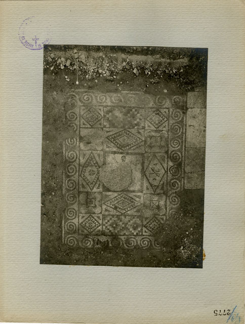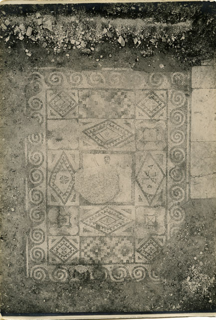 Pannello musivo che ornava il complesso noto in letteratura con il nome di "Grandi Terme", costruito ad Aquileia nel settore sud-occidentale della città antica in età tardocostantiniana. L'edificio, messo in luce negli anni Venti e attualmente in corso di scavo da parte dell'Università di Udine, è noto solo parzialmente: si conosce un ampio "frigidarium", collocato idealmente al centro del complesso, collegato in corrispondenza dei lati brevi mediante due lunghi corridoi a due aule simmetricamente opposte e di identiche dimensioni, interpretate come palestre/"apodyteria". A est del frigidario era situata la piscina mentre alcune emergenze poste a ovest sembrerebbero riconducibili alla zona del calidario/tepidario. Completavano il complesso una serie di altri vani, alcuni dei quali riscaldati, posti nelle immediate vicinanze delle due ampie palestre. Le terme erano dotate di un ricco apparato decorativo di cui rimane testimonianza nei rivestimenti in marmo e in mosaico, come si evince dalla foto in esame. Il particolare qui riprodotto ornava l'aula Nord, caratterizzata da una composizione musiva piuttosto articolata (identica, nell'organizzazione, a quella dell'aula Sud): attorno a un grande quadrato centrale decorato da Nettuno sul carro si disponevano sedici pannelli campiti da fitti ornati geometrici impreziositi da personaggi del mondo marino, tra cui Nereidi e Tritoni, e figure di atleti. Chiudevano la decorazione in corrispondenza dei lati brevi due pannelli rettangolari, lunghi come l'ambiente, decorati da soggetti maschili, da interpretare verosimilmente come atleti. Il pannello musivo della foto era collocato a est del quadrato centrale e mostra, entro un bordo a onde correnti, uno "stralcio" centrato di un reticolato di fasce bipartite, con i rettangoli campiti da losanghe inscritte e i quadrati ornati da quadrati inscritti bordati da fasce a onde; i quadrati angolari sono invece caricati da quadrati inscritti mentre i rettangoli posti lungo i lati brevi sono campiti da quadrati policromi a gradienti. Al centro della composizione, all'interno di un pannello quadrato, è raffigurato un fanciullo con la destra levata in segno di acclamazione conservato solo per la porzione del capo e del braccio levato, e restaurato in antico nella parte inferiore con tessere bianche. Il mosaico si data al secondo quarto del IV sec. d.C.