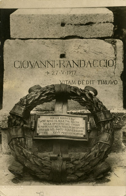 Tomba monumentale di Giovanni Randaccio (1884-1917) presso il Cimitero degli Eroi di Aquileia. Capitano di fanteria sul fronte carsico, G. Randaccio fu compagno e amico di Gabriele D'Annunzio, con il quale fronteggiò le battaglie dell'Isonzo. Morì durante la Decima battaglia dell'Isonzo nel tentativo di occupare le rovine del castello di Duino, posto oltre il corso del Timavo. Fu sepolto ad Aquileia e fu D'Annunzio stesso a idearne l'epitaffio "vitam dedit Timavo" inciso ai piedi del monumento, forse ispirandosi all'epigrafe romana scritta nel 129 a.C. per commemorare la vittoria sugli Istri, oggi conservata al Museo Archeologico Nazionale di Aquileia.