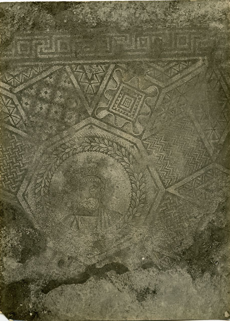 Particolare del mosaico che ornava il complesso noto in letteratura con il nome di "Grandi Terme", costruito ad Aquileia nel settore sud-occidentale della città antica in età tardocostantiniana. L'edificio, messo in luce negli anni Venti e attualmente in corso di scavo da parte dell'Università di Udine, è noto solo parzialmente: si conosce un ampio "frigidarium", collocato idealmente al centro del complesso, collegato in corrispondenza dei lati brevi mediante due lunghi corridoi a due aule simmetricamente opposte e di identiche dimensioni, interpretate come palestre "apodyteria". A est del frigidario era situata la piscina mentre alcune emergenze poste a ovest sembrerebbero riconducibili alla zona del calidario tepidario. Completavano il complesso una serie di altri vani, alcuni dei quali riscaldati, posti nelle immediate vicinanze delle due ampie palestre. Le terme erano dotate di un ricco apparato decorativo di cui rimane testimonianza nei rivestimenti in marmo e in mosaico, come si evince dalla foto in esame. Il particolare qui riprodotto ornava l'aula Nord, caratterizzata da una composizione musiva piuttosto articolata (identica, nell'organizzazione, a quella dell'aula Sud): attorno a un grande quadrato centrale decorato da Nettuno sul carro si disponevano sedici pannelli campiti da fitti ornati geometrici impreziositi da personaggi del mondo marino, tra cui Nereidi e Tritoni, e figure di atleti. Chiudevano la decorazione in corrispondenza dei lati brevi due pannelli rettangolari, lunghi come l'ambiente, decorati da soggetti maschili, da interpretare verosimilmente come atleti. La porzione di tessellato qui riprodotta apparteneva al pannello musivo che delimitava la composizione a nord, decorato da una composizione di ottagoni stellati e quadrati, formanti losanghe e triangoli negli spazi di risulta, con gli ottagoni campiti da busti maschili in proporzioni maggiori del vero. Degli originari cinque ottagoni se ne conservano solo quattro, di cui quello della foto in esame rappresenta quello centrale: mostra un personaggio anziano ammantato, caratterizzato da una folta barba bianca riccioluta e capelli a frange, con il capo adorno di una corona decorata da tre testine. Il mosaico si data al secondo quarto del IV sec. d.C.