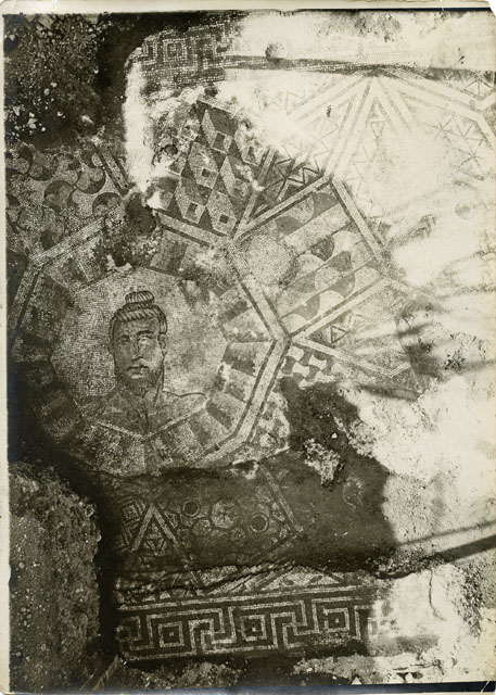 Particolare del mosaico che ornava il complesso noto in letteratura con il nome di "Grandi Terme", costruito ad Aquileia nel settore sud-occidentale della città antica in età tardocostantiniana. L'edificio, messo in luce negli anni Venti e attualmente in corso di scavo da parte dell'Università di Udine, è noto solo parzialmente: si conosce un ampio "frigidarium", collocato idealmente al centro del complesso, collegato in corrispondenza dei lati brevi mediante due lunghi corridoi a due aule simmetricamente opposte e di identiche dimensioni, interpretate come palestre "apodyteria". A est del frigidario era situata la piscina mentre alcune emergenze poste a ovest sembrerebbero riconducibili alla zona del calidario/tepidario. Completavano il complesso una serie di altri vani, alcuni dei quali riscaldati, posti nelle immediate vicinanze delle due ampie palestre. Le terme erano dotate di un ricco apparato decorativo di cui rimane testimonianza nei rivestimenti in marmo e in mosaico, come si evince dalla foto in esame. Il particolare qui riprodotto ornava l'aula Nord, caratterizzata da una composizione musiva piuttosto articolata (identica, nell'organizzazione, a quella dell'aula Sud): attorno a un grande quadrato centrale decorato da Nettuno sul carro si disponevano sedici pannelli campiti da fitti ornati geometrici impreziositi da personaggi del mondo marino, tra cui Nereidi e Tritoni, e figure di atleti. Chiudevano la decorazione in corrispondenza dei lati brevi due pannelli rettangolari, lunghi come l'ambiente, decorati da soggetti maschili, da interpretare verosimilmente come atleti. La porzione di tessellato qui riprodotta apparteneva al pannello musivo situato a nord dell'aula, ornato da una composizione di ottagoni stellati e quadrati, formanti losanghe e triangoli negli spazi di risulta, con gli ottagoni campiti da busti maschili in proporzioni maggiori del vero. Degli originari cinque ottagoni se ne conservano solo quattro, di cui quello della foto rappresenta il secondo da ovest: riproduce un uomo maturo, con la barba riccioluta e folta e i capelli biondi raccolti in una treccia arrotolata con tre giri sul capo. Il mosaico si data al secondo quarto del IV sec. d.C.