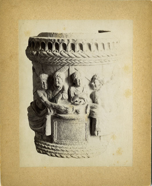 Cippo funerario in calcare di Aurisina che imita un cesto di vimini nei cordoli posti alla base e nella parte superiore, a cui si somma una decorazione a bacellature che rimanda invece alla lavorazione in terracotta o in bronzo.Nella porzione centrale si svolge una scena di banchetto funebre all'aperto, come sembrano suggerire le assi lignee riprodotte sullo sfondo. La raffigurazione è resa in modo realistico: attorno a un tavolo rotondo si colloca il letto tricliniare sul quale giacciono reclinati, sorretti con il braccio sinistro, i convitati, due coppie composte da un uomo e una donna. Nella porzione retrostante, non visibile nella foto (cfr. F17187), completano la scena un musico che suona il doppio flauto, un servo che porta un paniere di frutta e un'ancella intenta a preparare le bevande e i tovaglioli.La scena è connotata da notazioni reali e da dettagli veristici, evidenziati dal gesto di scongiuro della donna di destra e del servo, che rappresenta una reazione spontanea a qualcosa che è stato detto o fatto probabilmente da uno degli altri convitati. È possibile che l'urna non venne mai usata in quanto la tabella posta sotto al tavolo, che solitamente reca l'iscrizione funeraria, è invece vuota. L'opera è databile alla fine del I sec. a.C.La fotografia è stata utilizzata da V. Scarpa per realizzare il disegno pubblicato nel volume di Caprin, "Pianure friulane" (1892).