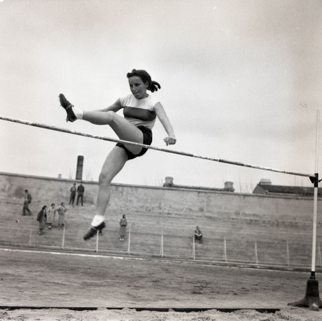 L'atleta nella specialità del salto in alto è ripresa nel superamento dell'asticella tramite sforbiciata e in seguito a stile ventrale, entrambi oramai in disuso essendo stati sostituiti, a partire dagli anni ottanta, dal Fosbury