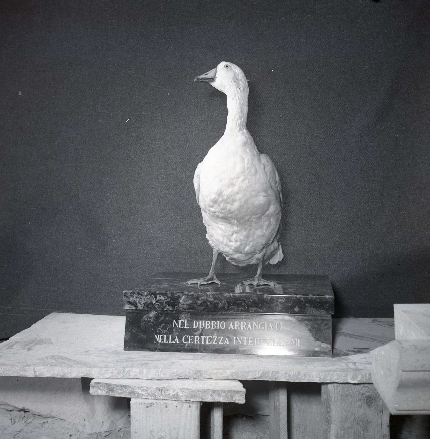 Ripresa di un'oca imbalsamata. Sulla base un'iscrizione: Nel dubbio arrangiati, nella certezza interpellami