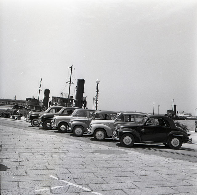 Sei automobili FIAT di vari modelli in un servizio fotografico pubblicitario commissionato dalla ditta di autonoleggi Franco e Bonetta, con sede in via Mazzini 1 a Trieste.
