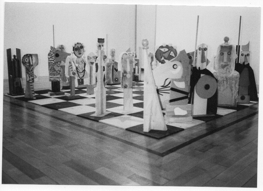 Gli Scacchi di Baj, realizzati nel 1988, sono un multiplo, ufficialmente con una tiratura di 30 esemplari (in realtà ne sono stati realizzati 15) + cinque contraddistinti da numeri romani da I a V. Dimensioni: altezza media dei pezzi cm 75; Scacchiera cm 272 x 272 composta da 64 caselle di cm 34 x 34; Pedana scacchiera cm 282 x 282 altezza cm 34.