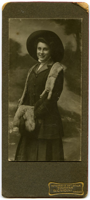 Giovane donna ritratta in piedi appoggiata a una sedia. Indossa un abito invernale con stola di volpe e tiene in mano un manicotto di volpe, in testa un grande cappello.