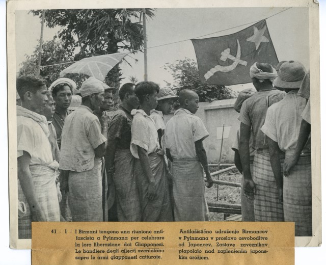 Birmani partecipano a una riunione antifascista a Pyinmana. Le bandiere inglesi e sovietiche troneggiano sopra le armi confiscate ai giapponesi