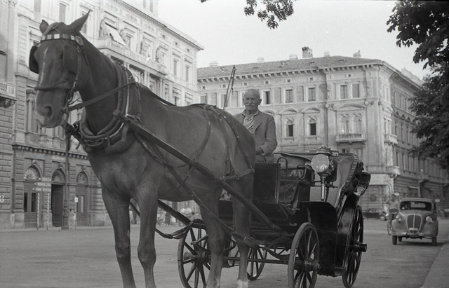 Nel 1954 ci sono 6 carrozzelle. Pietro Bologna, il più vecchio dei vetturini di Trieste (un istriano di 79 anni) è immortalato in cassetta sulla carrozza numero 27. (Le ultime notizie, 18.09.1954)