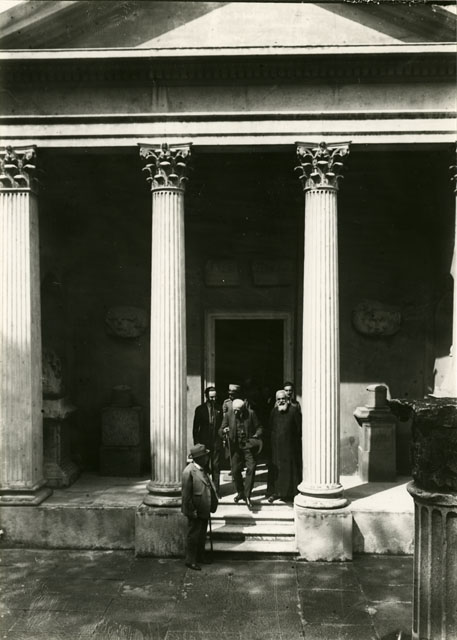 Visita del Maresciallo Luigi Cadorna all'Orto Lapidario e al Museo di Storia ed Arte di Trieste in data 19 agosto 1926. La foto, scattata alle ore 10.15, ritrae il maresciallo che esce dal tempietto neoclassico accompagnato dal conservatore del museo, Silvio Rutteri, visibile alla sua destra, dal Commendatore don Michelangelo, riconoscibile alla sua sinistra, e dal Conte Senatore Salvatore Segrè, che lo anticipa ai piedi dei gradini.