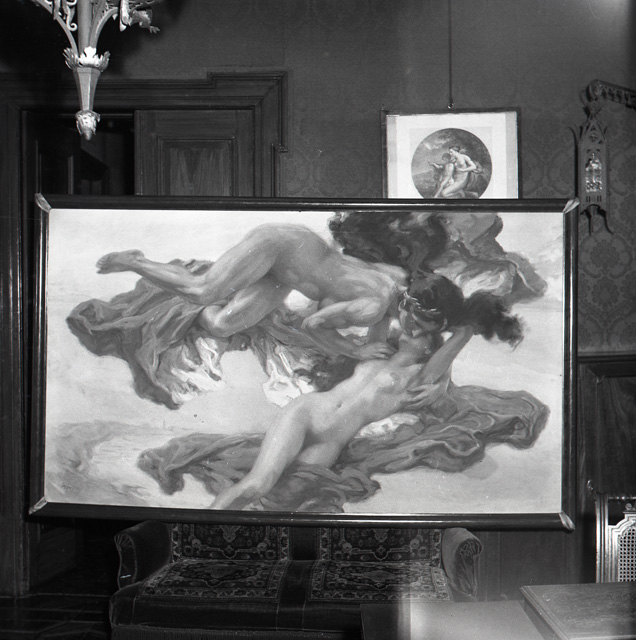Due dipinti, Piramide di fiori a San Giusto di Ugo Flumiani e Le campane della redenzione di Carlo Wostry, fotografati in una sala del Civico Museo Morpurgo. Il dipinto di Wostry venne esposto per la prima volta al Caffe degli Specchi il giorno dell'annessione di Trieste all'Italia.