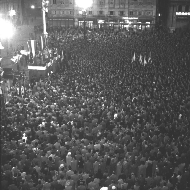 In vista delle elezioni del 25 maggio, si svolge un comizio con i partiti dell'apparentamento democratico: il Partito socialista della Venezia Giulia, con l'on. Zagari, il Partito repubblicano italiano, col ministro Pacciardi, il Partito liberale italiano, con l'on. Sanna Randaccio e la Democrazia Cristiana, col ministro Pella.