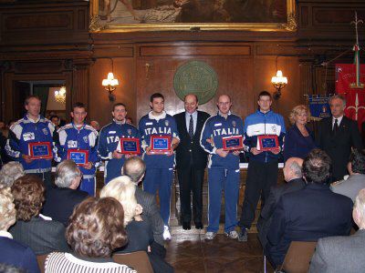 Nella sala del Consiglio Comunale il sindaco Roberto Dipiazza consegna il premio ad un giovane atleta azzurro, i giocatori nazionali di pallamano di Trieste, Irene Camber e Nino Benvenuti