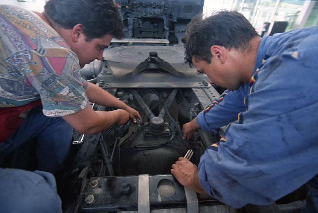 Camion, officine, meccanico, motore, computer.