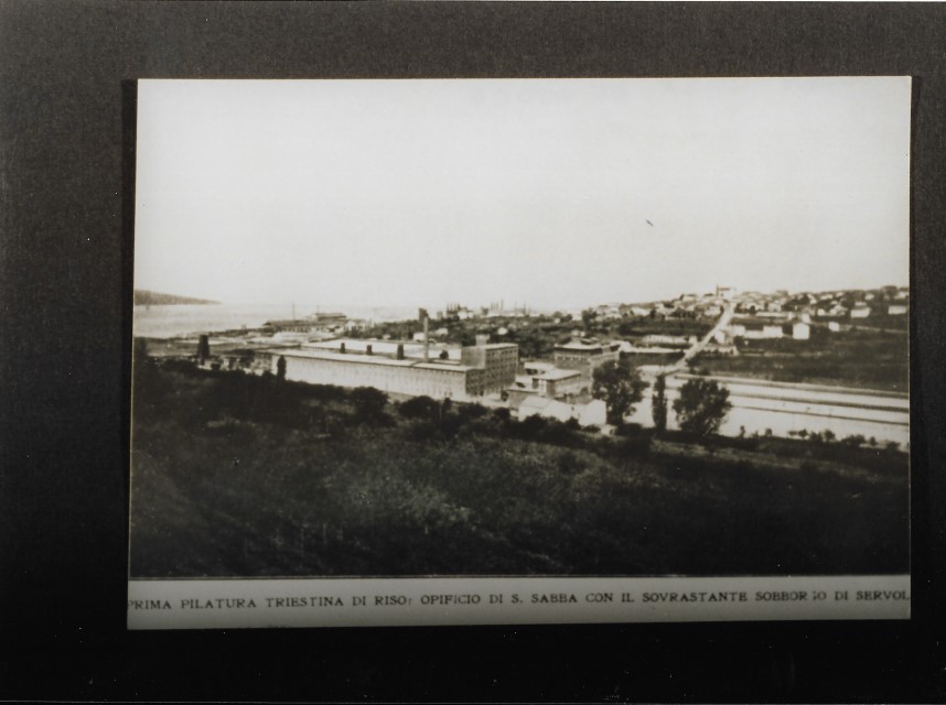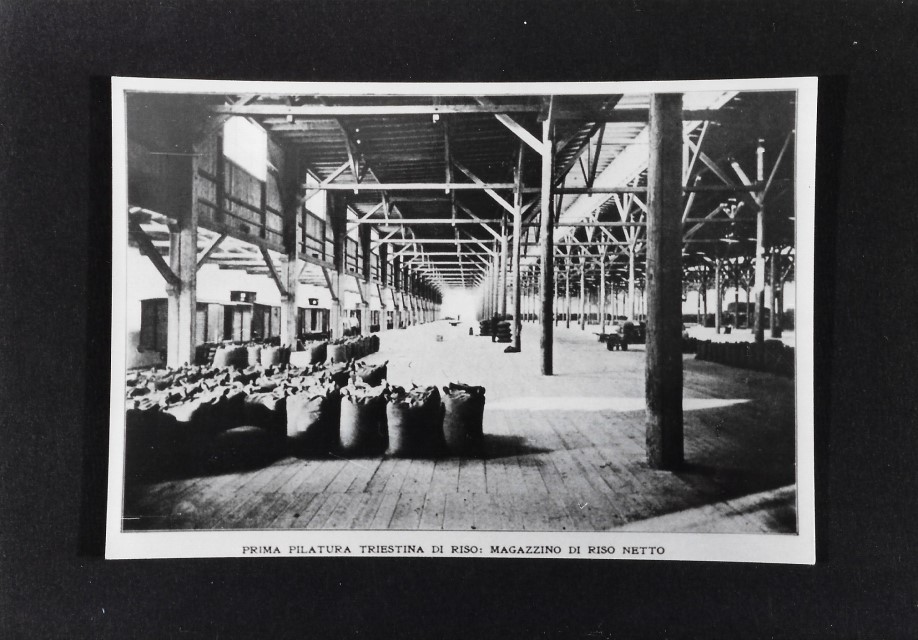 Riproduzione fotografica degli edifici della pilatura del riso, dei magazzini
