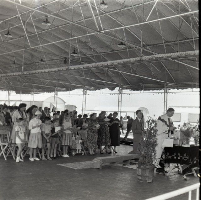 Viene celebrata una Messa sotto il tendone di un luna-park.