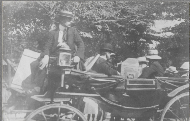 Il cofano dell'ampolla dantesca viene trasportato alla tomba di Dante in carrozza, scortato da Piero Sticotti (primo a sin), Glauco Cambon, Riccardo Zampieri, Carlo Wostry. A cassetta il giornalista Egidio Fabro.