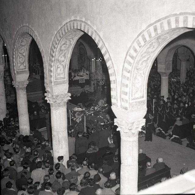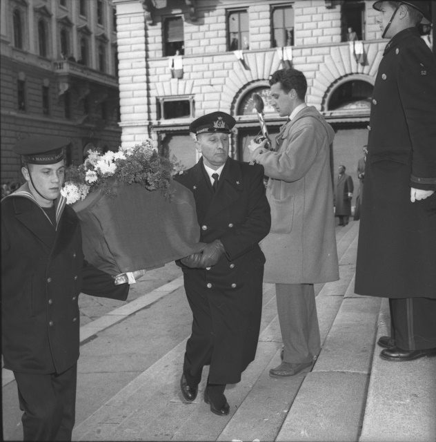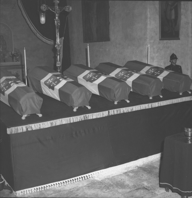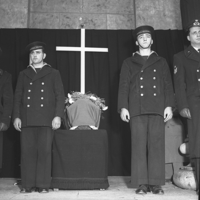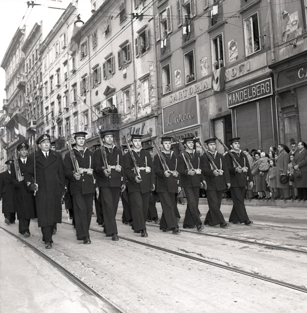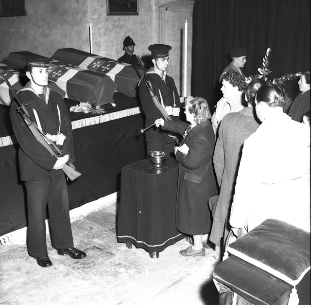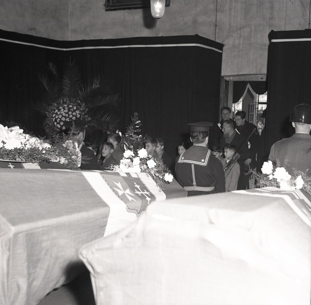Cerimonia funebre per le salme dei cinque marinai della nave da guerra Berenice affondata il 9 settembre 1943 dalle truppe tedesche nel golfo di Trieste, e recuperate nei mesi di gennaio e febbraio del 1951