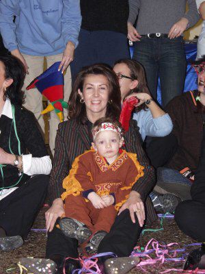 Claudia D'Ambrosio seduta a terra circondata da bambini mascherati