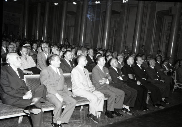 Alla cerimonia, che si è svolta al Ridotto del Verdi, erano presenti le più alte cariche cittadine e dello Stato e rappresentanti della varie istituzioni. L'onorevole Bettiol, che gli fu vicino lungamente e con affettuosa amicizia, ha fatto presente che Trieste è la prima città d'Italia che a otto giorni dalla dipartita di De Gasperi ne commemora la figura. Il Sindaco Bartoli ha ricordato come lo statista per la salvezza di Trieste e della zona B pose ad ostaggio la sua vita. Notizie tratte dal Giornale di Trieste 29.08.1954