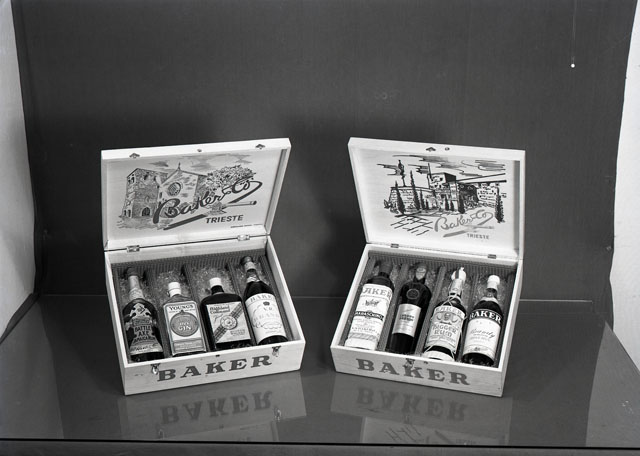Cassette natalizie di liquori della Baker s.p.a. di Trieste.La ditta Baker venne fondata a Londra nel 1898 da Arthur Arnold Baker e suo cugino George, specializzandosi nell'importazione, imbottigliamento e vendita di rum. Il 7 ottobre 1907 apre la filiale di Trieste, con stabilimento nel rione di Barcola dove venivano miscelati diversi tipi di rum centro-americano di altissima qualita', autentici distillati di canna di zucchero demerara, che venivano venduti in bottiglie con etichette dalla grafica poco comune. Il rum di Baker - l'Australian Rum e il Battle Axe Jamaica Rum - era particolarmente popolare tra i marinai delle navi inglesi che facevano scalo a Trieste, maggior porto dell'impero austro-ungarico. Ed altrettanto richiesto e diffuso nelle piu' qualificate pasticcerie di Vienna, Praga e Budapest per la confezione di dolci. Rifugiatosi in patria durante la 1. guerra mondiale, A.A.Baker rientra a Trieste nel 1918 riaprendo la stabilimento.Dopo numerosi passaggi di proprieta', la ditta fu trasferita nel 1983 a Gorizia per il particolare regime fiscale di alcuni componenti base (alcool, zucchero).
