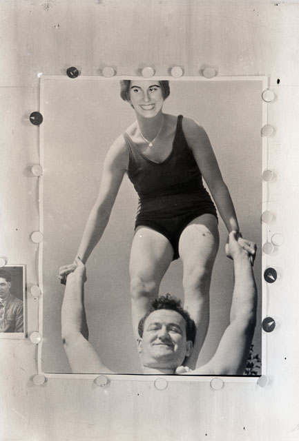 Donna in costume intero in equilibrio in piedi sulle spalle di un uomo che la sostiene