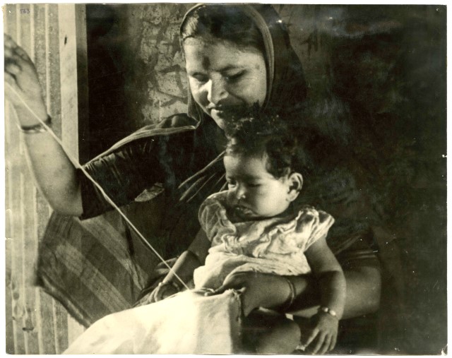 Ritratto di lavoratrice tessile hindu fotografata nell'atto di tessere una tenda mentre tiene il figlio in braccio