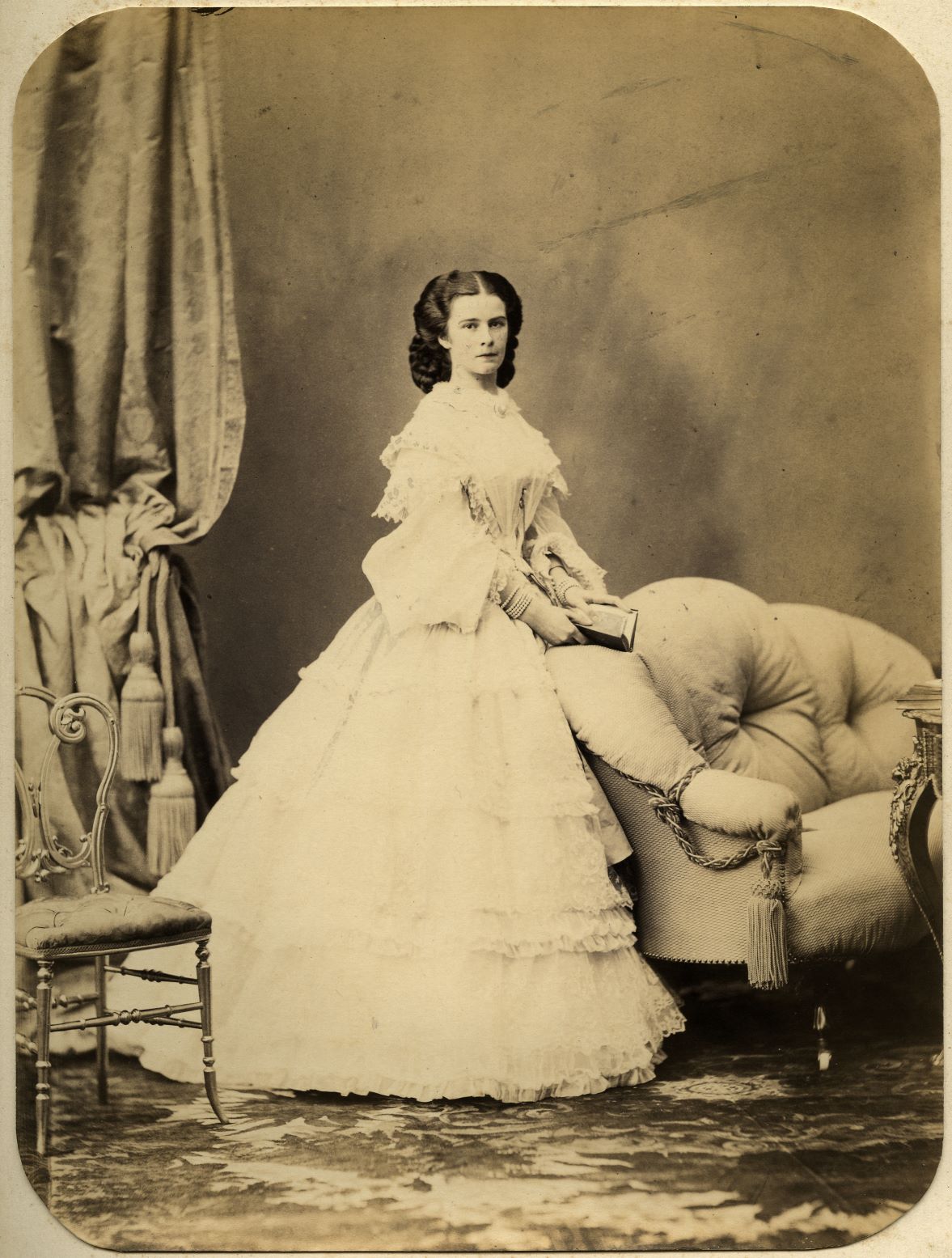 Angerer immortala Elisabetta in studio, a figura intera per enfatizzarne il rango, con un vestito di pizzo bianco, priva di orecchini, ma con vistosi braccialetti di perle bianche ai polsi. L’impiego della figura intera indica l’importanza attribuita all’intero spazio corporeo, con una grande attenzione ai dettagli: dalla ricchezza dell’abito, al contesto lussuoso e, solo parzialmente, al volto. Elisabetta è ritratta priva di trucco: incarnato perfetto, dotato di un corpo alto, snello e adorato. I tratti regolari, la sottigliezza e un sapiente uso della luce restituiscono la bellezza tout court dell’imperatrice. Lo sguardo melanconico non è solamente espressione di uno stato d’animo, ma è in sintonia con lo stile romantico della ritrattistica dell’epoca: Elisabetta appare sola con gli accessori tipici degli studi dei pittori, prima, e dei fotografi, poi, ovvero, la colonna, la tenda, la sedia, il tavolino rotondo.