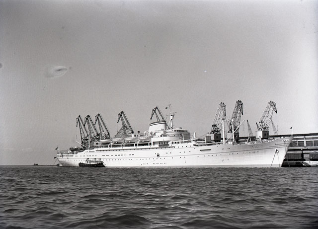 Vista del porto Duca d'Aosta con ormeggiate molte navi : Africa, Risano, Sebastiano Caboto (tutte di proprieta' del Lloyd Triestino di navigazione) e Etna.