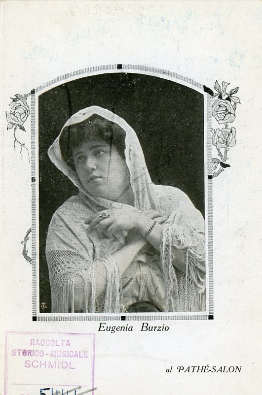 Eugenia Burzio al Pathé Salon. A Milano si poteva ascoltare a pagamento i brani più famosi incisi su dischi Pathé. Era un antico jukebox dove attraverso un telefono si faceva il numero del brano richiesto e sotto negli scantinati delle signorine addette facevano girare il disco su grammofoni con enormi trombe. A Trieste in Piazza della Borsa 14