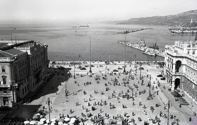 Il servizio comprende vedute di piazza Unità dall'alto in occasione della Festa dell'uva, altre vedute della città, delle rive e della baia di Sistiana
