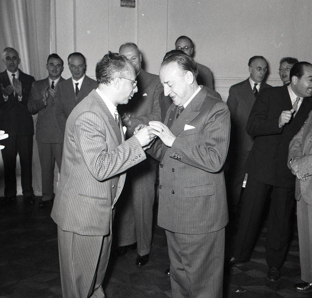 L'avv. Vitelli, direttore superiore per gli affari civili dell'Amministrazione del G.M.A., e il marchese Cristoforo Fracassi, consigliere politico del governo italiano presso il G.M.A., si congedano durante un ricevimento ufficiale tenuto presso il Municipio, dalle massime autorità cittadine