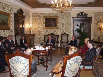 Gli assessori comunali Maurizio Bradaschia e Giorgio Rossi assieme agli assessori regionali Sergio Dressi, Federica Seganti e Franco Franzutti durante l'incontro con l'ambasciatore olandese Ole Philipson, nel salotto azzurro del Municipio.