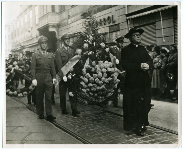 Corteo funebre che dalla cappella di San Giovanni si snoda per il piazzale della cattedrale di San Giusto, via Capitolina, piazza Unità, piazza Sansovino, galleria Sandrinelli, corso Garibaldi, viale D'Annunzio, Piazza Foraggi dove il corteo si scioglie.