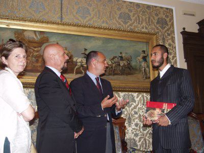 Il vicesindaco Renzo Codarin, Al Saadi Gheddafi jr ed Amilcare Berti presidente dell'US Triestina