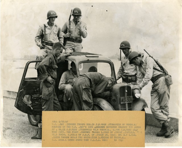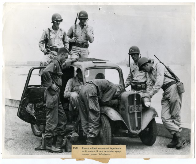 Una truppa americana dell'undicesima divisione aerea ispeziona il motore di un'automobile giappponese nella città di portuale di Yokohama, invasa il 29 agosto 1945.