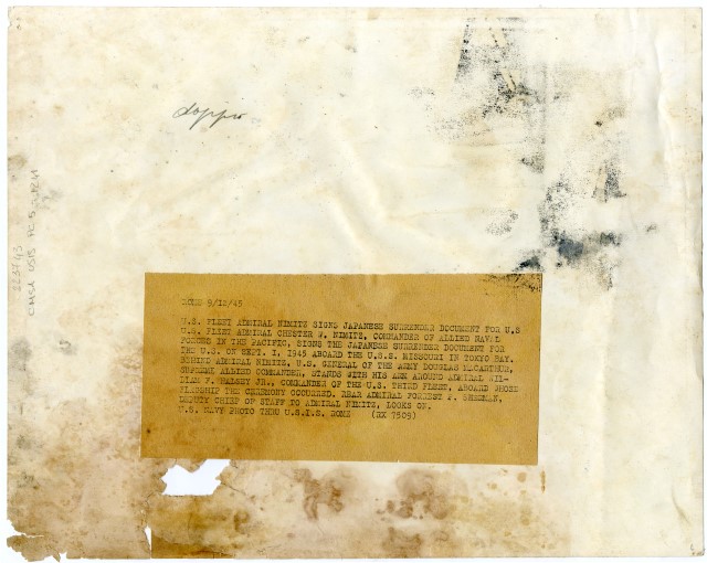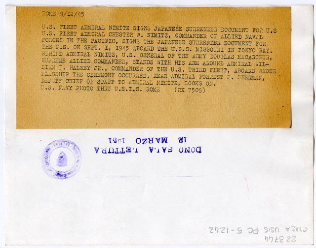 Sulla nave «Missouri», attraccata nella baia di Tokyo, il 01/09/1945, il comandante della Marina americana Chester W. Nimitz firma il documento della resa del Giappone.