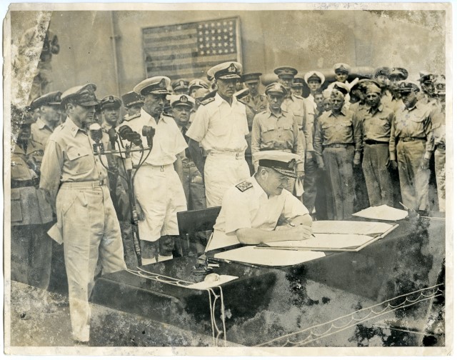 L' ammiraglio Bruce Fraser, firma la resa giapponese il 2 settembre 1945 a bordo della nave Missouri attraccata nella baia di Tokyo.