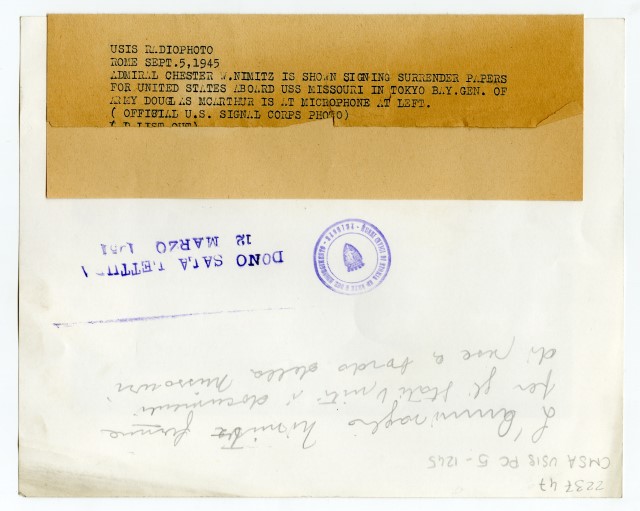 L'Ammiraglio Chester W. Nimitz firma i documenti della resa del Giappone sulla nave Missouri nella Baia di Tokyo, nel settembre del 1945.