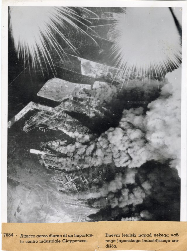 Veduta aerea dell'esplosione, a seguito di un bombardamento americano, di un centro industriale giapponese.