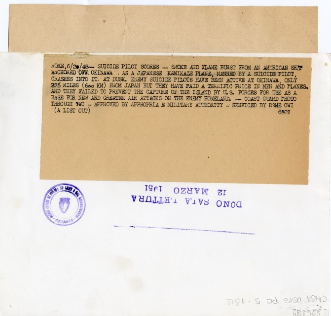 Una nave americana in fiamme dopo un attacco suicida da parte di un aereo giapponese nelle acque di Okinawa.