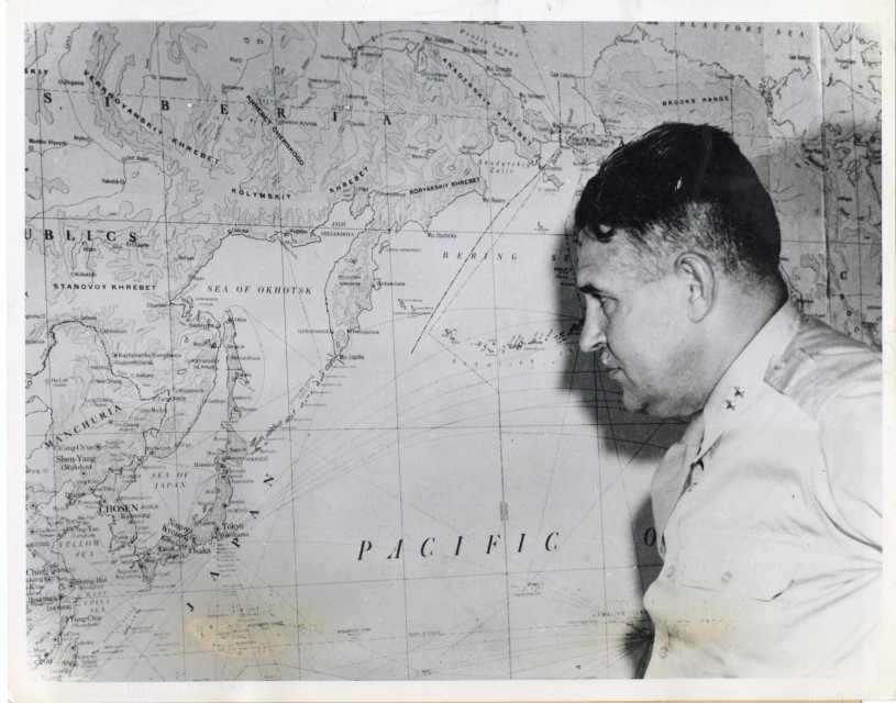 Il Generale Leslie R. Groves studia una carta geografica dell'Asia durante i preparativi per il lancio della bomba atomica.