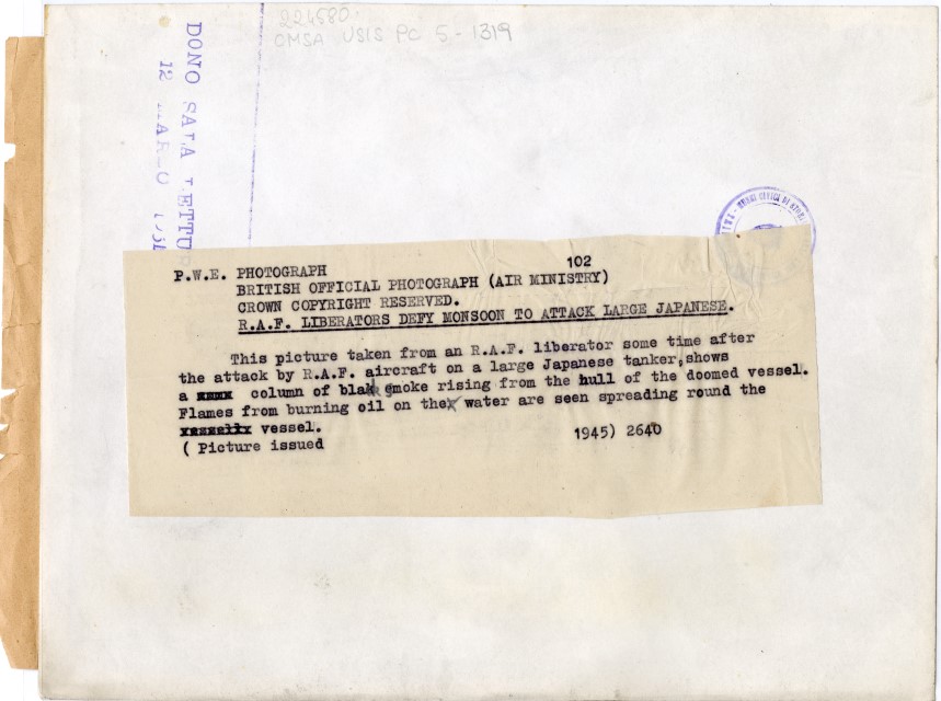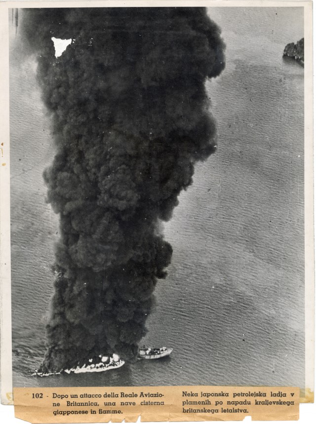Veduta aerea di una nave giapponese in fiamme a seguito di un bombardamento da parte dell'Aviazione britannica