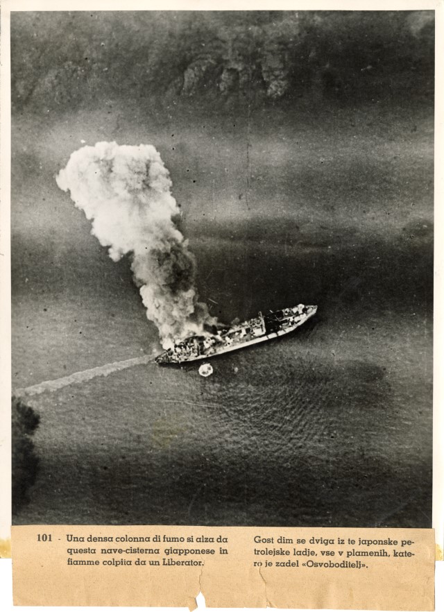 Veduta aerea di una nave giapponese in fiamme a seguito di un bombardamento da parte dell'Aviazione britannica