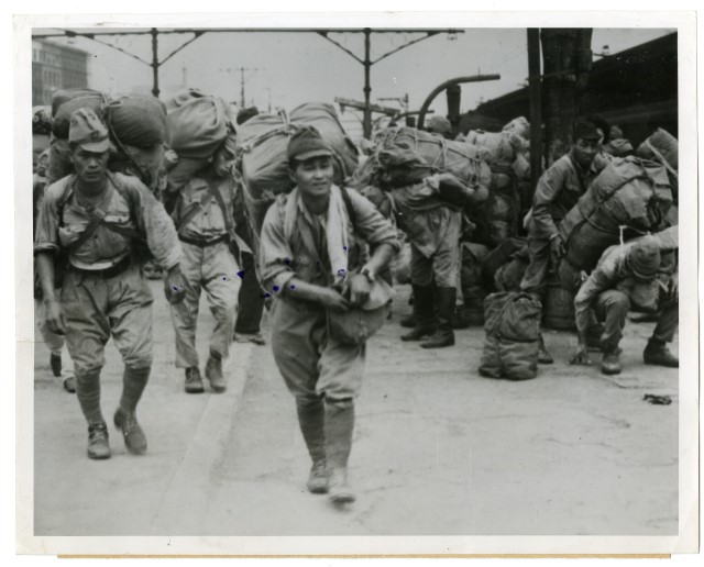 Alcuni soldati giapponesisi trovano alla stazione ferroviaria di Tokyo e sono pronti a tornare a casa, dopo la firma della resa del Giappone del 2 settembre 1945.
